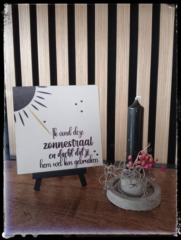 Deze prachtige houten tegel is voorzien van een klein takje onder in de hoek. Deze wordt geleverd op een klein schilders ezeltje. De zonnestraal is goud van kleur