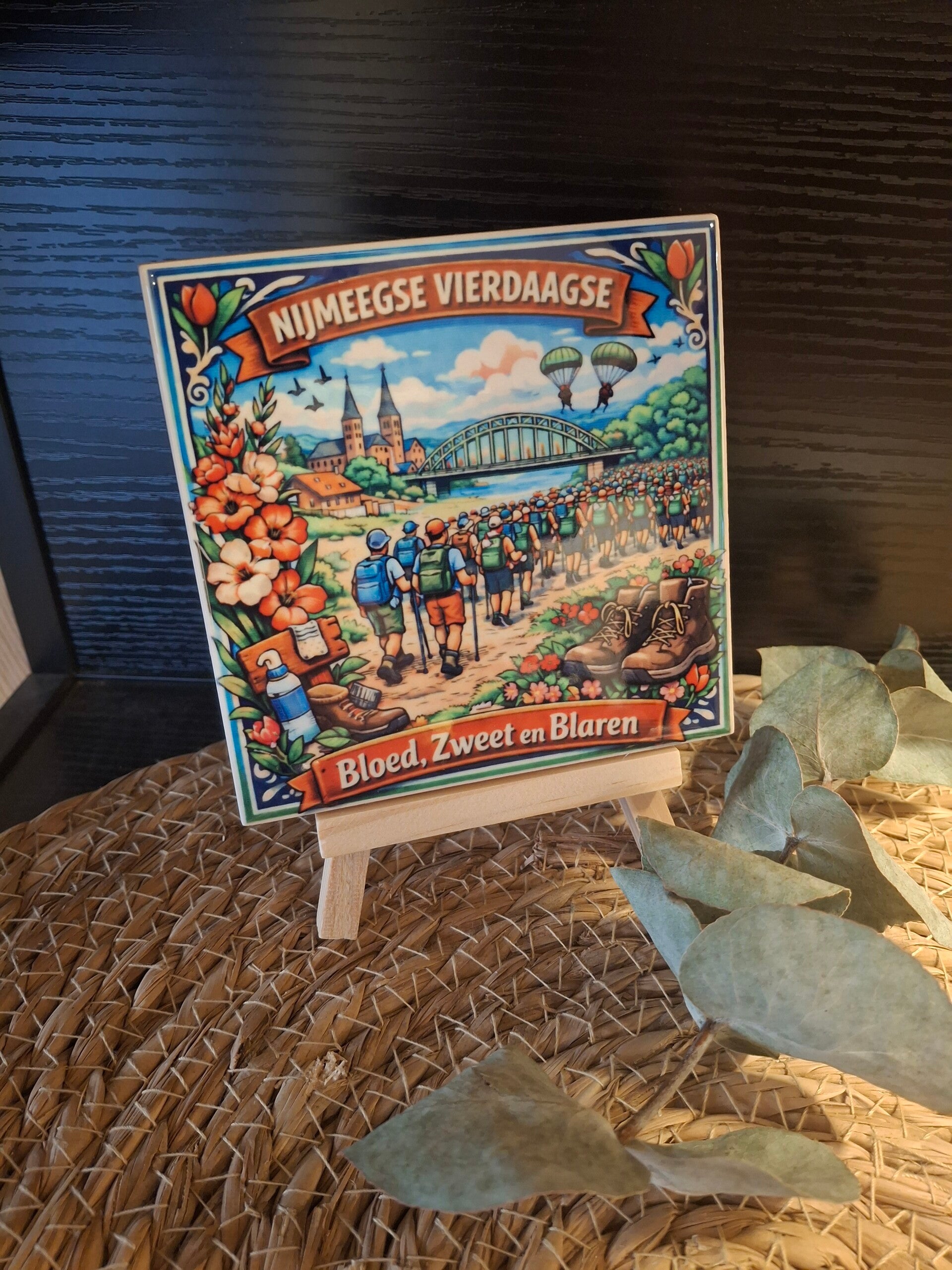 Een blijvende herinnering aan de legendarische Nijmeegse Vierdaagse! Dit sfeervolle tegeltje is een eerbetoon aan vier dagen vol kilometers, doorzettingsvermogen en trots.